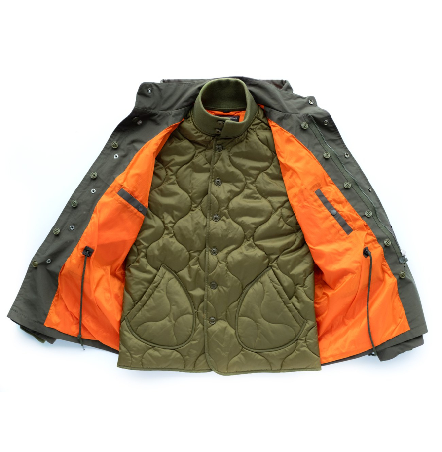 • Подкладка куртки M‑65, как и в классической версии, представляет собой самостоятельный элемент гардероба. Она изготовлена из прочного нейлона рипстоп и дополнена полиэстеровым утеплителем. Модель оснащена удобными каплевидными карманами, а также тёплым трикотажным воротом и манжетами. Подкладка крепится к куртке с помощью пуговиц, но при этом её можно носить отдельно — в качестве самостоятельной верхней одежды.
