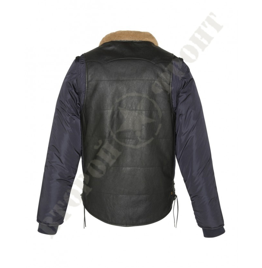 • Интересная модель - куртка-жилет. Передняя и задняя часть выполненые из телячьей кожи, создают форму классического мотожилета с боковыми утяжками на кожаных шнурках. Рукава куртки отстегиваются на молнии. Таким образом, получается теплый жилет.