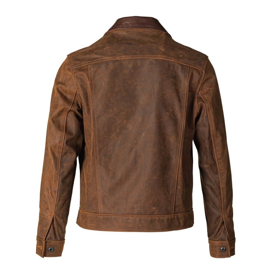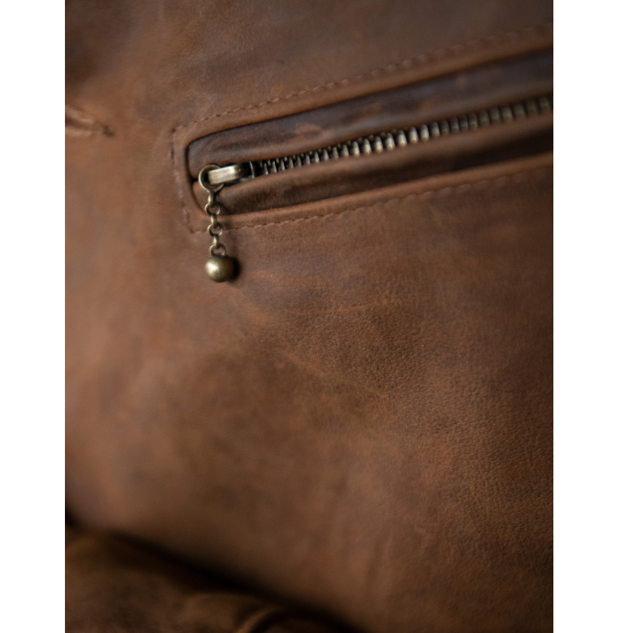 • Модель представлена в благородном коричневом оттенке, который подчёркивает естественную текстуру полунубука и придаёт куртке стильный, слегка винтажный облик.